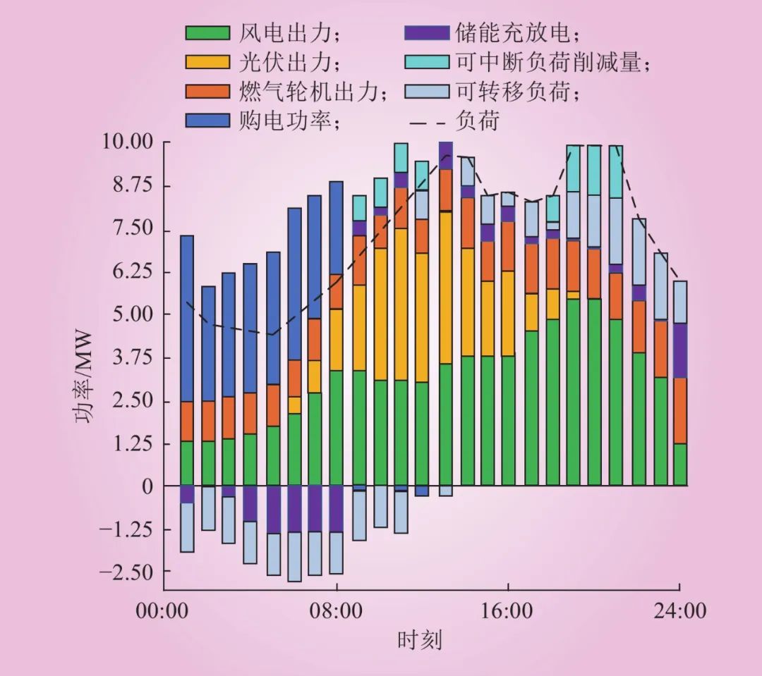 圖6為儲能參與電能量平衡情況,可以看出,新能源出力全部得到消納,解決了棄風、光問題,滿足綠色低碳要求;儲能幾乎全時段參與電能量平衡過程,具有雙向特性,與內(nèi)部成員CDG等聯(lián)合,根據(jù)內(nèi)部負荷與外部市場價格的情況綜合制定合適的發(fā)電功率,削減高價時段負荷,增加低價時段負荷,從而使VPP在購電價格較高的13:00—18:00、22:00—次日01:00和18:00—22:00不進行購電,在09:00—13:00進行售電,最大程度節(jié)省購電成本。