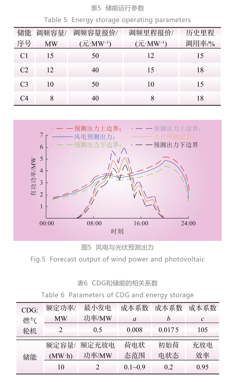 以IEEE-30節(jié)點系統(tǒng)來驗證儲能參與調(diào)頻市場出清模型,系統(tǒng)含10臺機組,6臺為火電機組(G1~G6),4臺儲能(C1~C4),參數(shù)如表3~5所示。由VPP聚合的靈活性資源(儲能、CDG、柔性負荷、光伏與風電)在01:00—09:00參與填谷調(diào)峰,在09:00—13:00和18:00—22:00參與削峰調(diào)峰,全天24時段可參與電能量市場。風電、光伏出力預(yù)測如圖5所示,日前預(yù)測出力誤差為10%,可調(diào)控柔性負荷區(qū)間為2~6 MW,VPP內(nèi)CDG和儲能相關(guān)參數(shù)如表6所示。