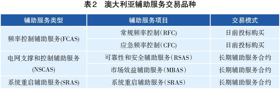 澳大利亞電力市場分為國家電力市場(NEM)和批發(fā)電力市場(WEM),除西澳大利亞州采用批發(fā)電力市場外,其他州執(zhí)行國家電力市場。2001年起,澳大利亞電力工業(yè)結(jié)構(gòu)重組并構(gòu)建統(tǒng)一電力市場體系,此時國家電力市場的輔助服務(wù)品種主要包含頻率控制輔助服務(wù)(FCAS)。2009年,澳大利亞重新建立電力監(jiān)管體系,國家電力市場的輔助服務(wù)品種進行相應(yīng)的擴充。截至2022年,澳大利亞國家電力市場的輔助服務(wù)品種如表2所示。