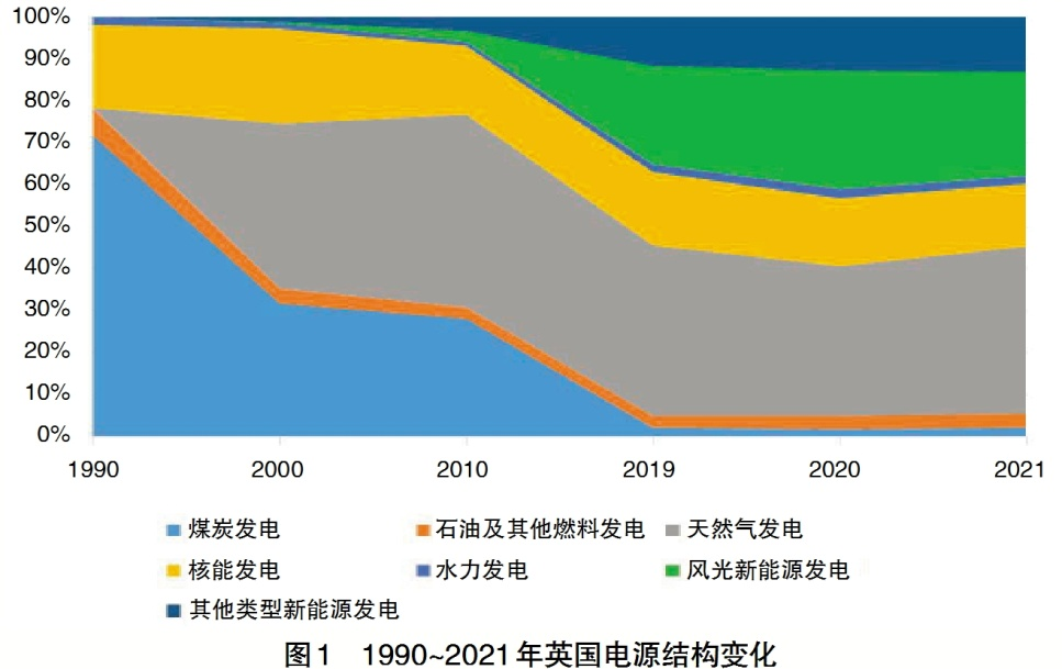 2019年,英國通過《氣候變化法案》,明確2050年脫碳的目標(biāo),但由于新型冠狀病毒肺炎疫情的流行及俄烏沖突導(dǎo)致的能源供需急劇變化讓英國的能源轉(zhuǎn)型備受挑戰(zhàn),圖1為1990~2021年英國電源結(jié)構(gòu)變化情況,2021年英國全國發(fā)電出力相較于2020年下降1.4個百分點。同時,受極端天氣影響,新能源出力占比由2020年的43.2%下降至2021年的39.7%。但新能源出力占比依然較前幾年有較大的提升。