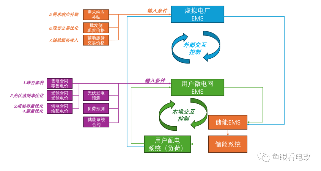對(duì)儲(chǔ)能系統(tǒng)的EMS提出了更高的要求,不僅要實(shí)現(xiàn)本地的控制策略,還要疊加一層外部交互的策略,并且這兩層策略之間還需要耦合優(yōu)化,所以需要實(shí)現(xiàn)虛擬電廠EMS、用戶微電網(wǎng)EMS、儲(chǔ)能EMS的雙層耦合,儲(chǔ)能EMS自己無法解決外部性控制的需求。