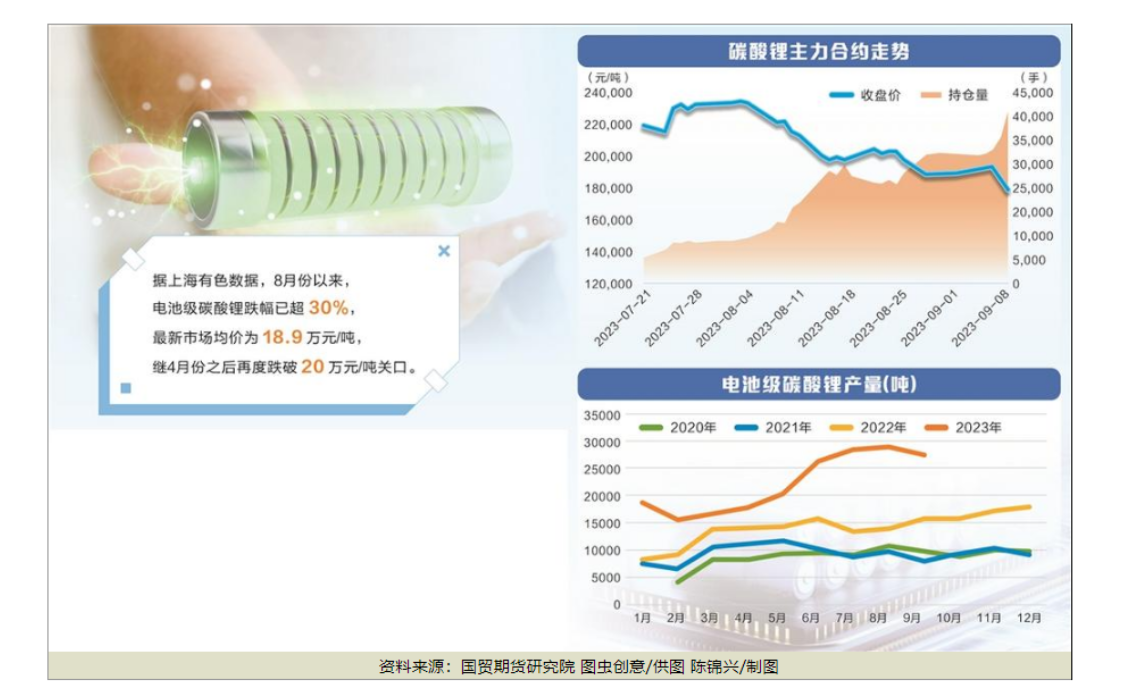 下游采購動(dòng)力不足,原材料隨之走跌,電池級(jí)碳酸鋰再度跌破20萬元/噸,上海有色顯示的最新市場(chǎng)均價(jià)為18.9萬元/噸。
