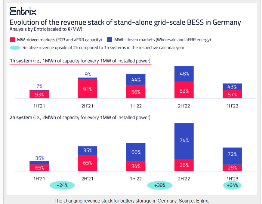 正如Entrix公司提供的圖表所示,德國運營的兩小時電池儲能系統(tǒng)的優(yōu)勢已經(jīng)從2021年的24%大幅增長到2022年的38%。
