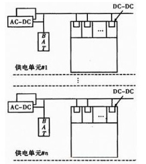 在每個(gè)供電單元中,首先若干個(gè)中小功率的AC-DC高頻開關(guān)整流模塊采用N+1冗余方式并聯(lián),將220VAC或380 VAC變成-48 VDC或24VDC;然后與一組或二組中小容量的電池組并聯(lián),提供統(tǒng)一不間斷的-48 VDC或24 VDC;然后通過DC匯流母排,給每個(gè)機(jī)架中每個(gè)機(jī)框中的每塊電路板上的DC—DC變換電路供電,DC—DC變換電路將-48 VDC或24 VDC變換為所在電路板所需的12 VDC和/或5 VDC和/或3.3VDC和/或2.5VDC和/或1.8 VDC等。