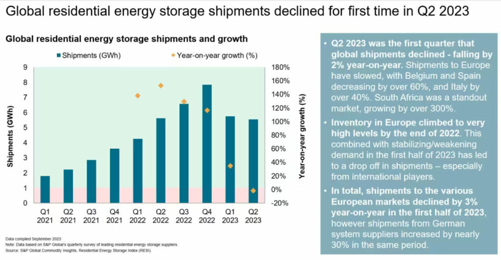 中國儲能網(wǎng)訊:標(biāo)準(zhǔn)普爾全球(S&P Global)公司在日前發(fā)布的一份研究報告指出,在能源價格波動較小、庫存高企以及成本上升的背景下,全球住宅儲能系統(tǒng)出貨量在2023年第二季度首次同比下降。