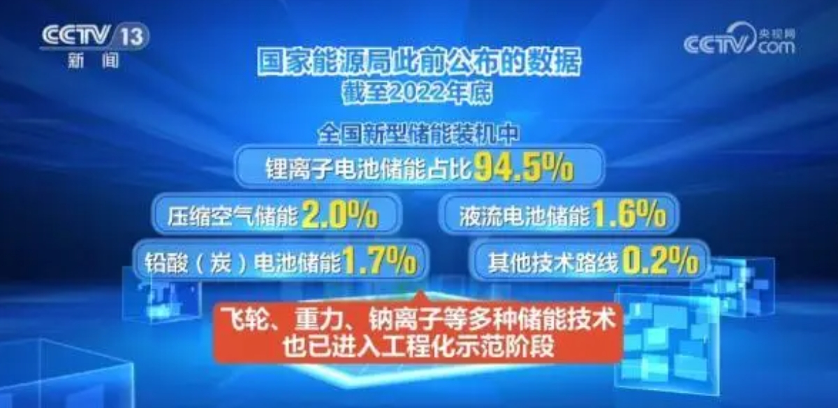國家能源局此前公布的數(shù)據(jù),截至2022年底,全國新型儲能裝機中,鋰離子電池儲能占比94.5%、壓縮空氣儲能2.0%、液流電池儲能1.6%、鉛酸(炭)電池儲能1.7%,其他技術路線0.2%。飛輪、重力、鈉離子等多種儲能技術也已進入工程化示范階段。
