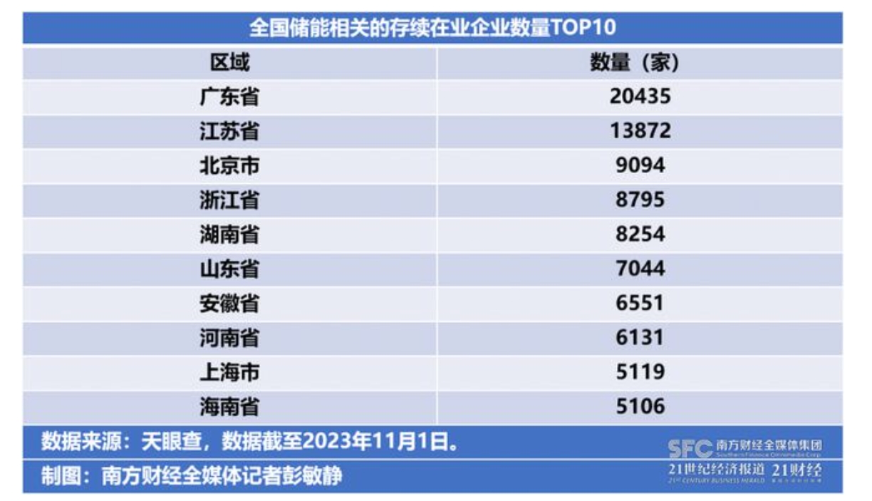 南方財經(jīng)全媒體記者查詢天眼查數(shù)據(jù)了解到,截至11月1日,全國存續(xù)在業(yè)的儲能相關(guān)企業(yè)共144634家,其中廣東以20435家位居全國之首,占比14%;江蘇和北京分別以13872家、9094家,排名第二、第三。
