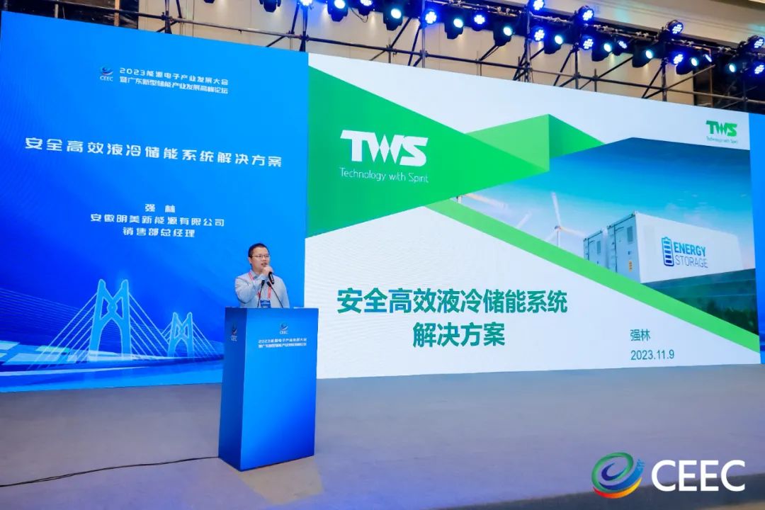 中國儲能網(wǎng)訊:2023年11月9日,安徽明美新能源有限公司(以下簡稱“TWS明美新能源”)應(yīng)邀出席了由珠海市人民政府、廣東省工業(yè)和信息化廳、中國化學(xué)與物理電源行業(yè)協(xié)會舉辦的“2023能源電子產(chǎn)業(yè)發(fā)展大會暨廣東新型儲能產(chǎn)業(yè)發(fā)展高峰論壇”。會議上,TWS明美新能源銷售總監(jiān)強林發(fā)表了題為《安全高效液冷儲能系統(tǒng)解決方案》的主旨演講,深入探討了儲能市場的發(fā)展趨勢、面臨的挑戰(zhàn)以及明美儲能觀等話題。