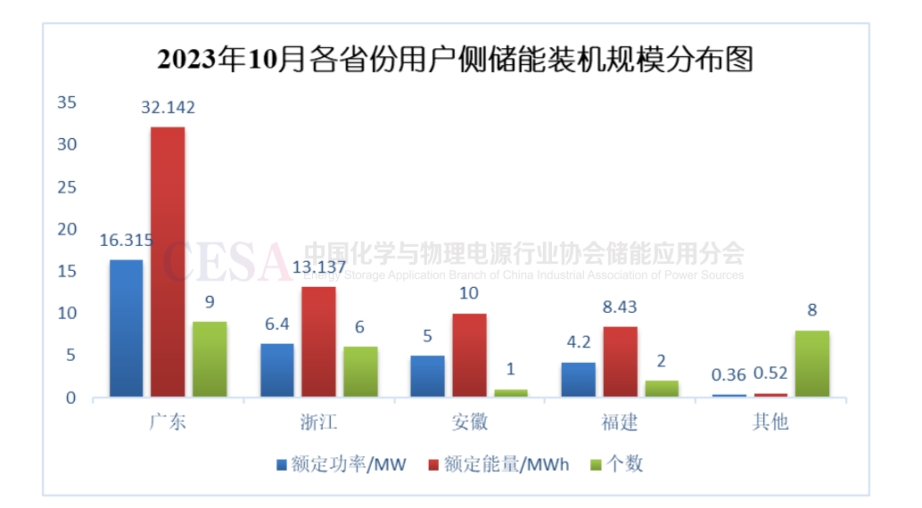 圖2-3-1 2023年10月各省份用戶側(cè)新型儲(chǔ)能裝機(jī)規(guī)模分布圖