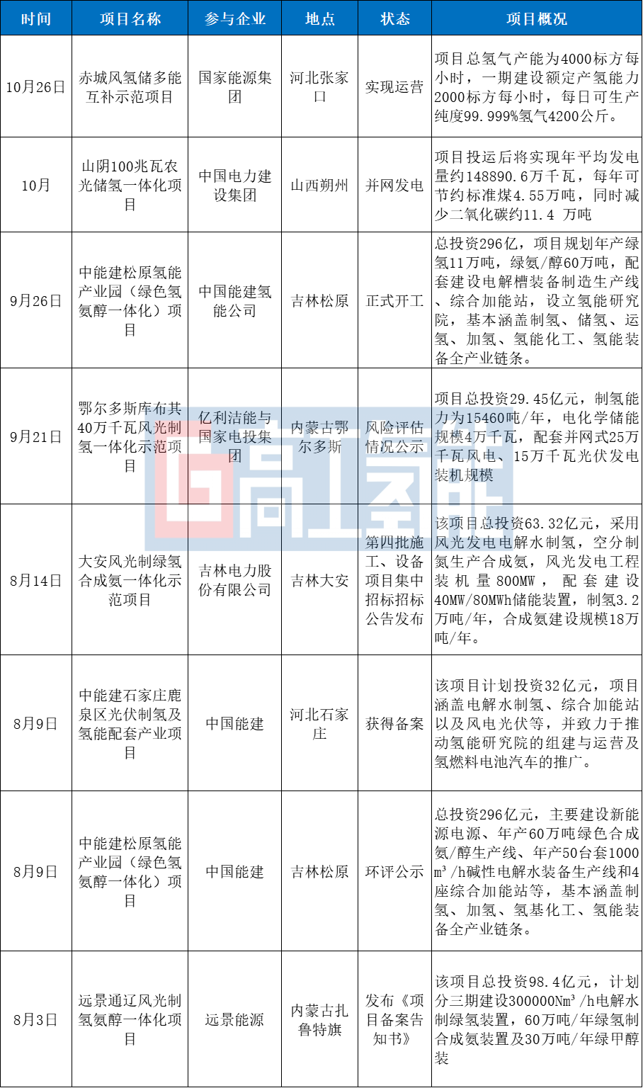 據(jù)統(tǒng)計(jì),目前國(guó)內(nèi)有數(shù)十個(gè)項(xiàng)目正在推進(jìn),總投資超過(guò)一千億元。以下為近期國(guó)內(nèi)風(fēng)光氫儲(chǔ)一體化項(xiàng)目最新進(jìn)展情況(來(lái)源網(wǎng)絡(luò)公開(kāi)資料,統(tǒng)計(jì)或有疏漏):