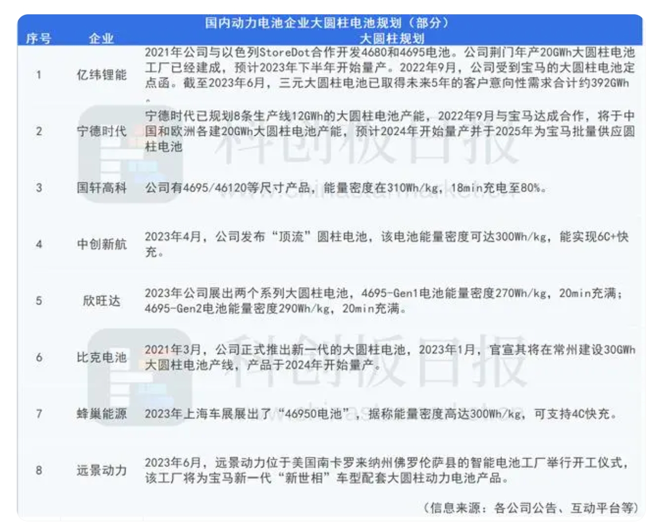 從已有布局來(lái)看,據(jù)《科創(chuàng)板日?qǐng)?bào)》記者不完全統(tǒng)計(jì),寧德時(shí)代、中創(chuàng)新航、億緯鋰能、國(guó)軒高科等均在加速布局大圓柱電池。
