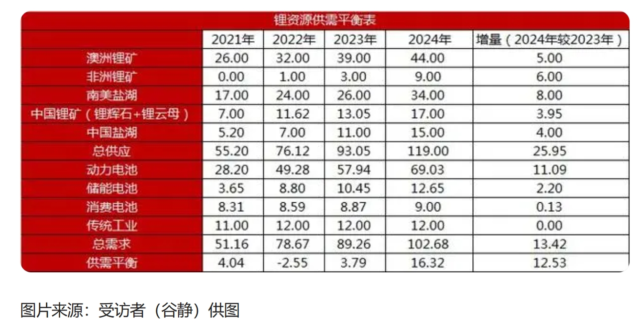 一德有色研究員谷靜向記者表示,根據(jù)對過往兩年鋰資源供需的情況來看,2024年鋰資源的過剩量將繼續(xù)擴大。