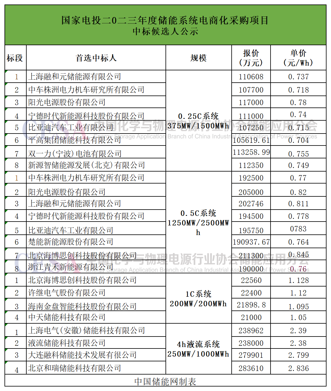0.25C系統(tǒng)共8個標段,采購規(guī)模1.5GWh,此前共吸引了65家企業(yè)投標,最終融和元儲、中車株洲所、陽光電源、寧德時代、比亞迪、平高集團、雙一力、新源智儲共8家公司預(yù)中標8家企業(yè)入圍首選中標人,報價區(qū)間為0.704-0.780元/Wh。