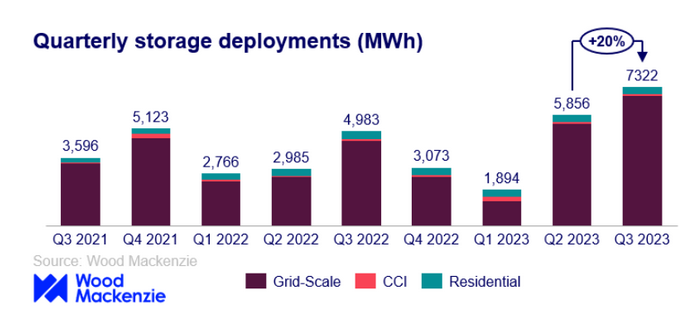 中國儲能網(wǎng)訊:根據(jù)調(diào)研機(jī)構(gòu)Wood Mackenzie日前發(fā)布的研究報告,美國儲能行業(yè)又經(jīng)歷了一個破紀(jì)錄的季度,在2023年第三季度部署的儲能系統(tǒng)的裝機(jī)容量為2354MW,儲能容量為7322MWh。
