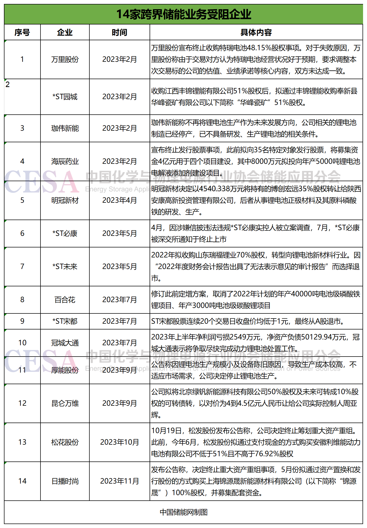 據(jù)不完全統(tǒng)計(jì),今年已經(jīng)有14家跨界儲(chǔ)能企業(yè)業(yè)務(wù)受阻,有的放棄儲(chǔ)能業(yè)務(wù),有的轉(zhuǎn)型失敗,直接退市。