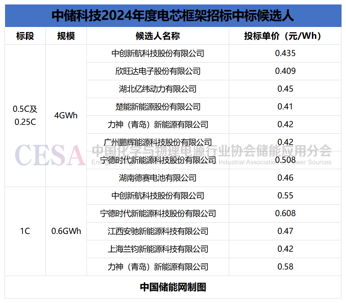 12月24日,中儲(chǔ)科技公示2024年度電芯框架招標(biāo)中標(biāo)候選人,兩個(gè)段共有10個(gè)候選人入圍。