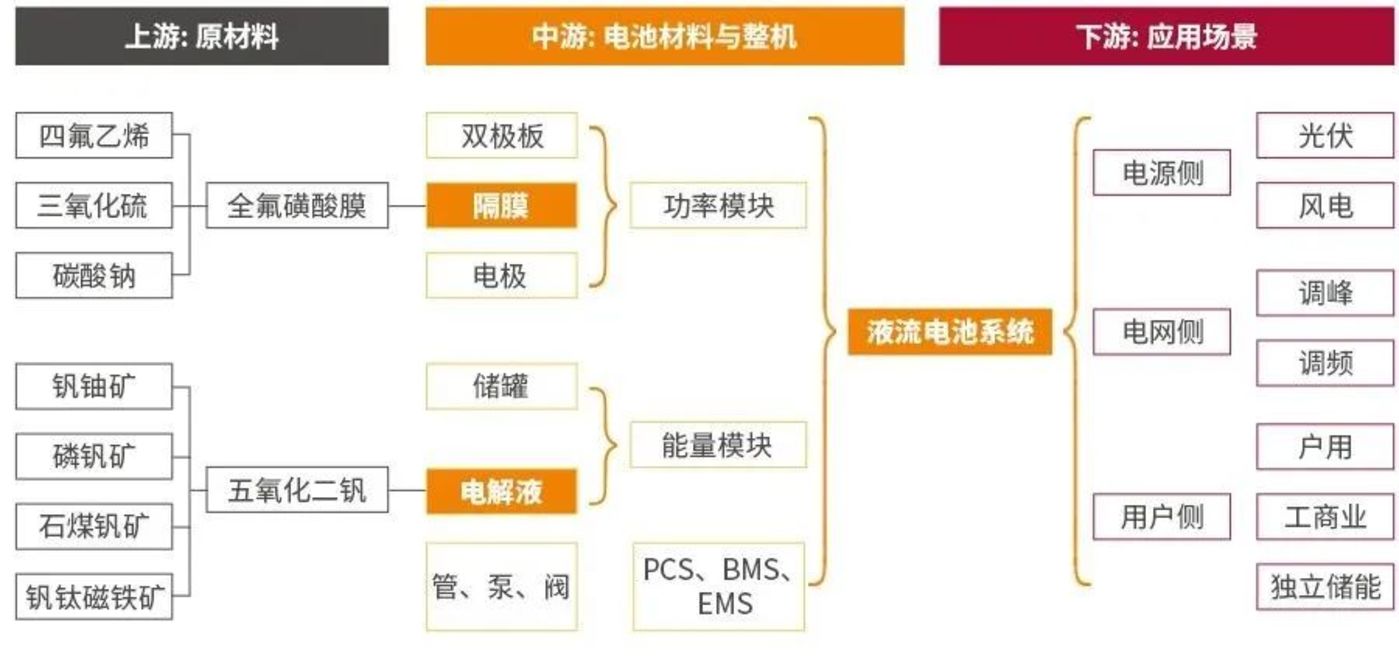 目前全釩液流電池的技術(shù)成熟度逐漸提高,產(chǎn)業(yè)鏈逐步成型,處于導(dǎo)入期向成長(zhǎng)期過(guò)渡階段。其上游主要涉及各項(xiàng)原材料,包括五氧化二釩、全氟磺酸膜等;產(chǎn)業(yè)中游為電解液配制、電堆裝配、控制系統(tǒng)等其他設(shè)備,其中電解液配置技術(shù)和電堆制造技術(shù)壁壘最高;下游儲(chǔ)能主要應(yīng)用于發(fā)電側(cè)、電網(wǎng)側(cè)以及用戶側(cè),主要包括風(fēng)光發(fā)電配儲(chǔ)、電網(wǎng)調(diào)峰調(diào)頻、戶用、工商業(yè)以及獨(dú)立儲(chǔ)能等細(xì)分領(lǐng)域。