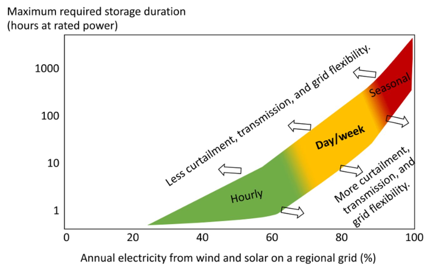 圖2:最佳儲(chǔ)能時(shí)長(zhǎng)與風(fēng)光滲透率關(guān)系 圖源:Albertus P , Manser J S , Litzelman S .Long-Duration Electricity Storage Applications, Economics, and Technologies[J].Joule, 2020, 4(1):21-32.DOI:10.1016/j.joule.2019.11.009.