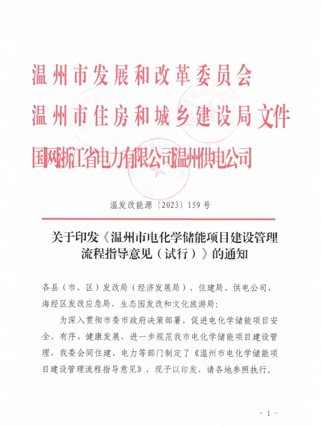 中國儲能網(wǎng)訊:12月27日,溫州市發(fā)展和改革委員會、溫州市住房和城鄉(xiāng)建設(shè)局、國網(wǎng)浙江省電力有限公司溫州供電公司等多部門聯(lián)合印發(fā)《溫州市電化學(xué)儲能項目建設(shè)管理流程指導(dǎo)意見(試行)》(以下簡稱“指導(dǎo)意見”)。