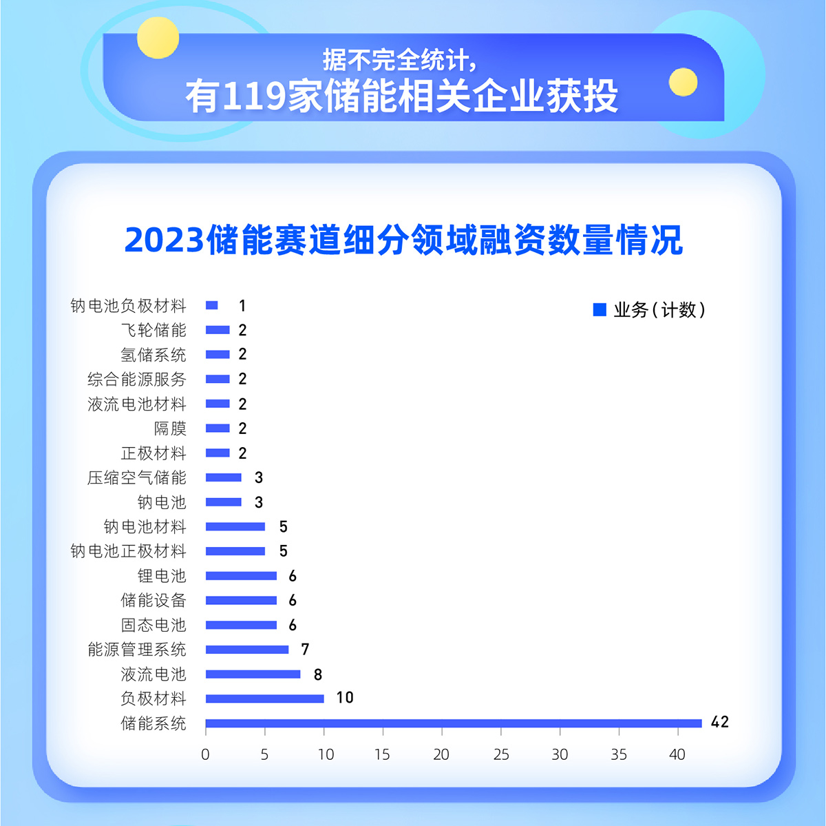 據(jù)不完全統(tǒng)計,2023年儲能相關(guān)領(lǐng)域有119家企業(yè)完成一級市場融資,有42家企業(yè)從事儲能系統(tǒng)集成,包括工商業(yè)儲能、戶用儲能、便攜式儲能,尤其在政策和成本驅(qū)動下,工商業(yè)儲能發(fā)展前景更加明晰,成為2023年最受資本追捧的領(lǐng)域。