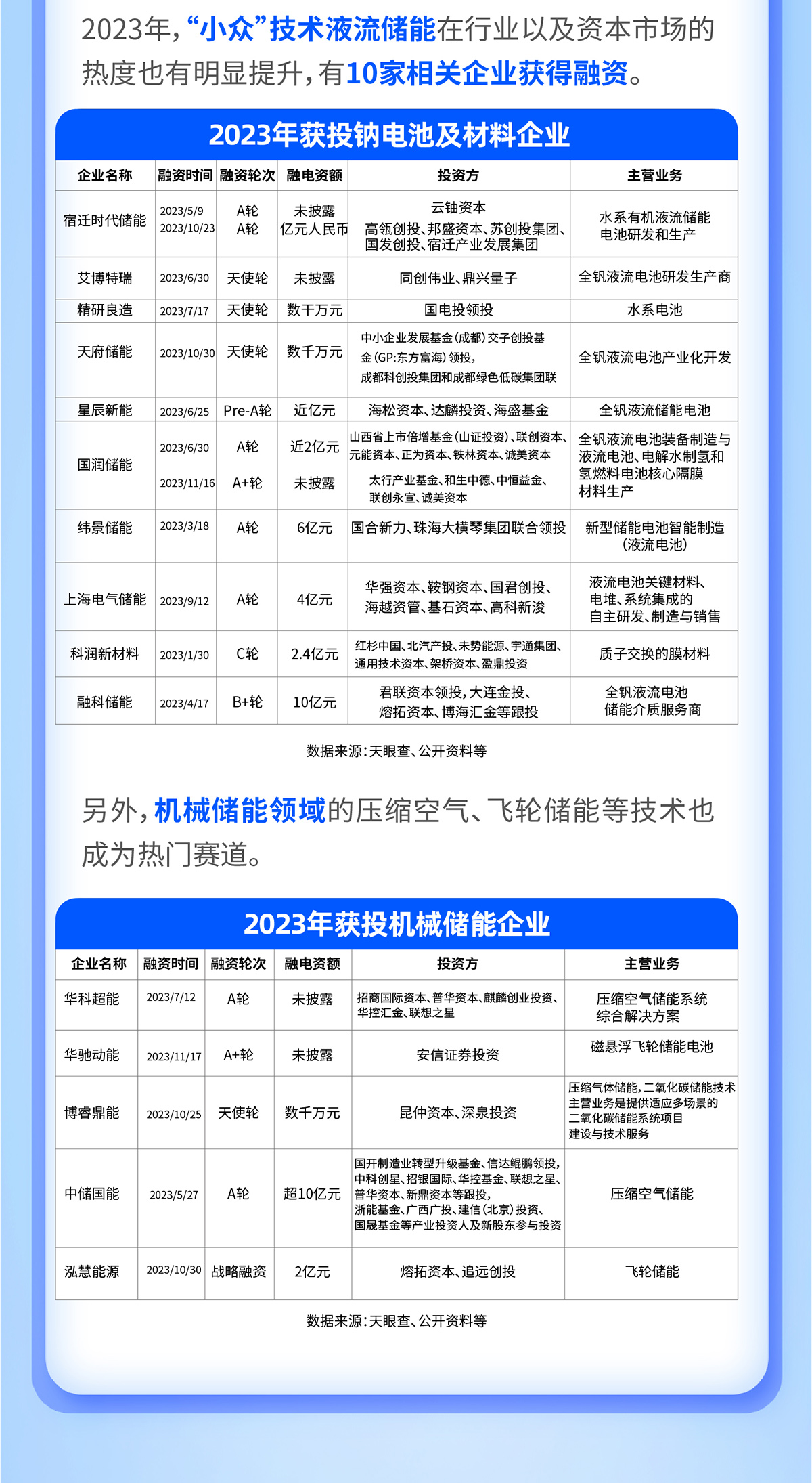 與此同時,在政策與市場需求的雙重驅(qū)動下,新型儲能也成為資本競逐的方向。據(jù)不完全統(tǒng)計,2023年有14家鈉電池及材料廠商完成融資,有6家固態(tài)電池企業(yè)拿到融資。