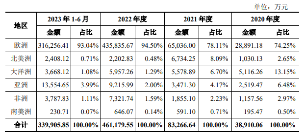 從營收區(qū)域構(gòu)成來看,歐洲成為艾羅能源的“盈利場”。近三年來,其70%的營收來自歐洲市場。僅2022年,艾羅能源來自歐洲的營收就超過40億元人民幣,占比更是達到了94.50%。