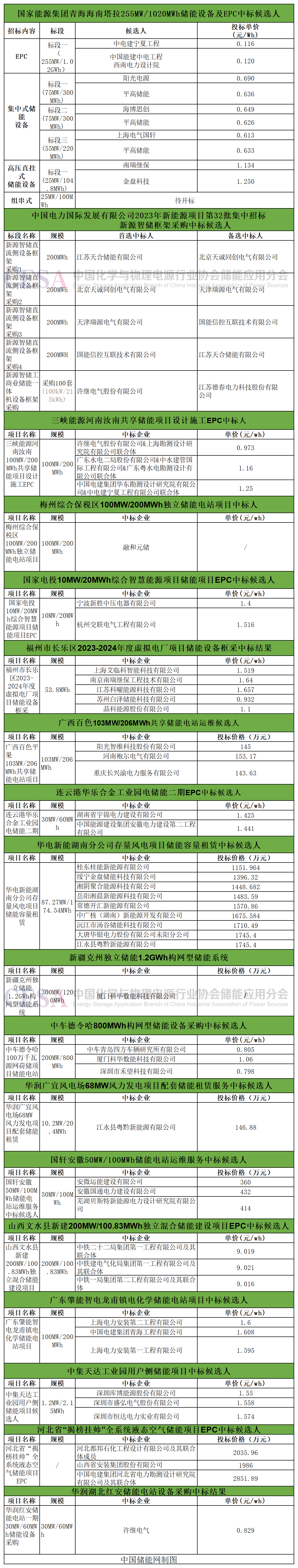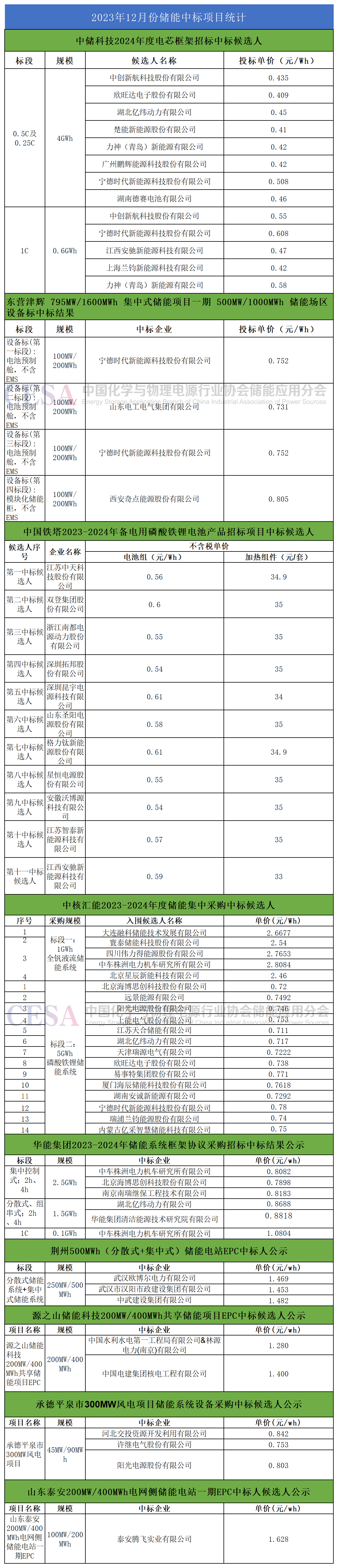 其中一些比較大的項(xiàng)目有:12月24日,中儲(chǔ)科技公示2024年度電芯框架招標(biāo)中標(biāo)候選人,兩個(gè)段共有10個(gè)候選人入圍。
