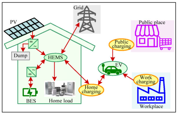 在這個(gè)新模型中,假設(shè)采用了一個(gè)家庭能源管理系統(tǒng)(HEMS),該系統(tǒng)根據(jù)電價(jià)格決定是否向電網(wǎng)輸入或輸出能源。它可以從電網(wǎng)、電池儲(chǔ)能系統(tǒng)或電動(dòng)汽車獲取電力,并向所有這些地方輸出能源。此外,它可以從住宅太陽(yáng)能系統(tǒng)和電動(dòng)汽車獲得電力。