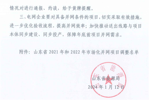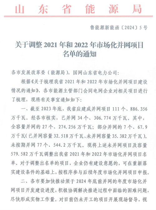 根據(jù)文件,截至2023年底,山東省應(yīng)建成并網(wǎng)項(xiàng)目111個(gè)、886.356 萬(wàn)千瓦。經(jīng)各市核實(shí),已并網(wǎng)34個(gè)、306.774萬(wàn)千瓦。其中,全容量并網(wǎng)的27個(gè)、274.256萬(wàn)千瓦;部分并網(wǎng)的7個(gè)、67.9 萬(wàn)千瓦(已并網(wǎng)容量32.518萬(wàn)千瓦、未并網(wǎng)容量35.382萬(wàn)千瓦),未按期并網(wǎng)77個(gè)、544.2萬(wàn)千瓦。