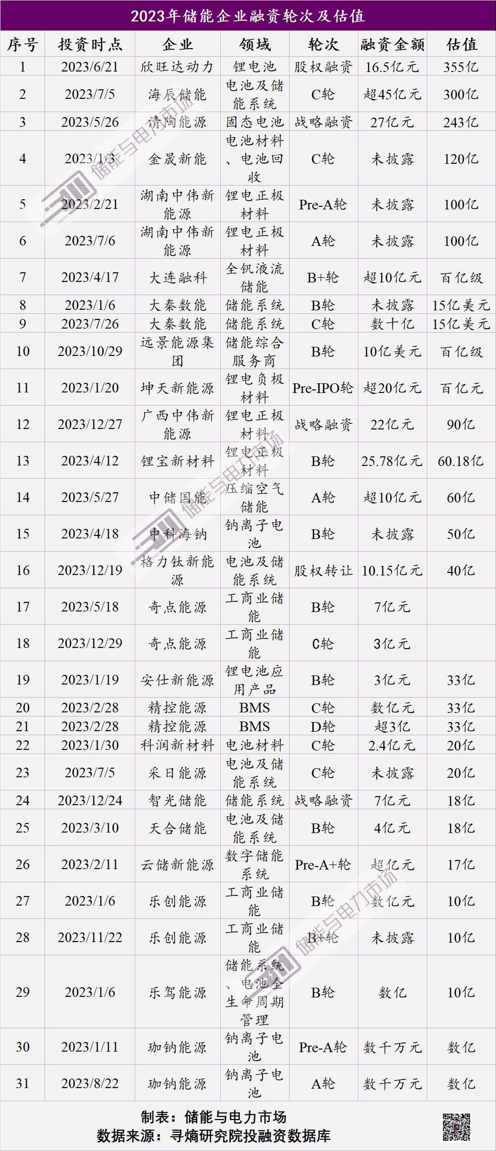 根據(jù)目前已披露估值情況,達(dá)到百億級估值的企業(yè)有9家,其中欣旺達(dá)動力的估值最高,為355億,海辰儲能300億,清陶能源243億。