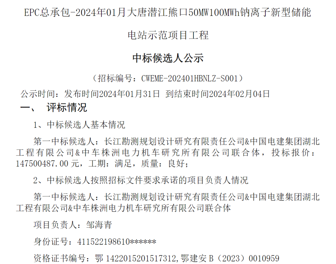 中國儲能網(wǎng)訊:1月31日,大唐潛江熊口50MW/100MWh鈉離子新型儲能電站示范項目工程EPC中標(biāo)候選人公示。