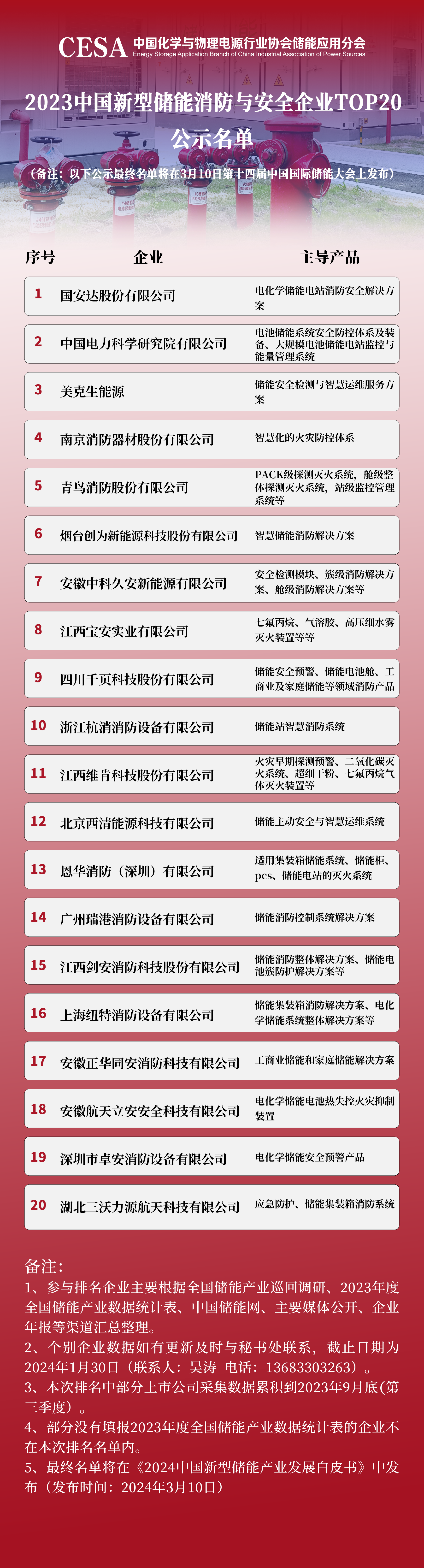 本次儲能產(chǎn)業(yè)鏈百強企業(yè)評選活動針對的對象主要是 CESA 儲能應(yīng)用分會廣大會員企業(yè)和與儲能業(yè)務(wù)緊密相關(guān)的上市公司,評價數(shù)據(jù)以2023年為準,主要通過協(xié)會實地走訪調(diào)研、會員企業(yè)年度數(shù)據(jù)申報、媒體披露和上市公司年報等多個渠道,最終形成2023中國新型儲能鋰離子電池企業(yè)TOP20、2023中國新型儲能系統(tǒng)集成企業(yè)TOP30、2023中國新型儲能PCS企業(yè)TOP30、2023中國新型儲能液流電池企業(yè)TOP30、2023中國工商業(yè)儲能企業(yè)TOP60、2023中國新型儲能BMS企業(yè)TOP10、2023中國新型儲能飛輪儲能企業(yè)TOP10、2023中國新型儲能溫控系統(tǒng)企業(yè)TOP20、2023中國新型儲能消防與安全企業(yè)TOP 20、2023中國新型儲能壓縮空氣儲能企業(yè)TOP10及2023中國新型儲能產(chǎn)業(yè)企業(yè)TOP100名單。