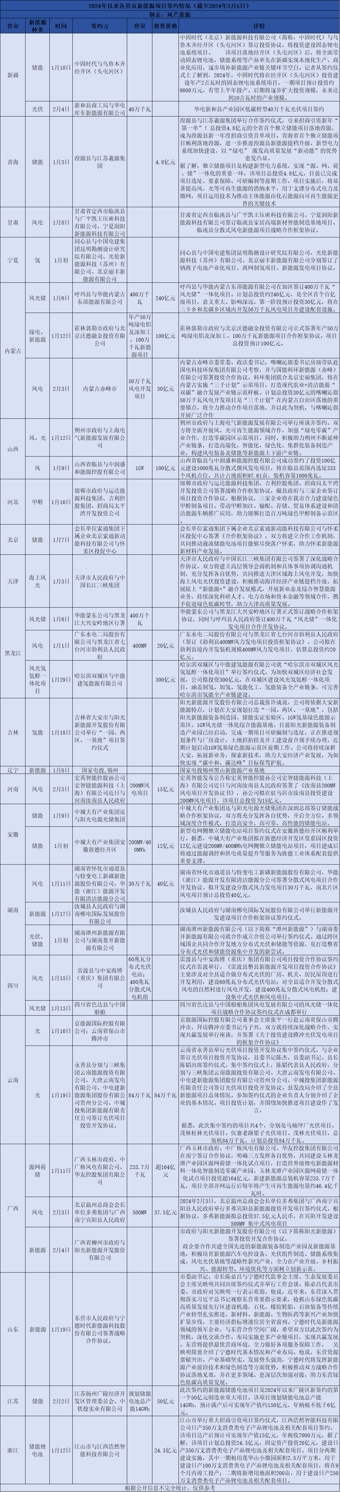 中國儲(chǔ)能網(wǎng)訊:新年伊始,新能源企業(yè)步履不停。風(fēng)芒能源根據(jù)公開信息不完全統(tǒng)計(jì),截至2月5日,已有多個(gè)企業(yè)在新疆、青海、內(nèi)蒙古、黑龍江、湖南、四川等21個(gè)省市就新能源項(xiàng)目簽約合作。