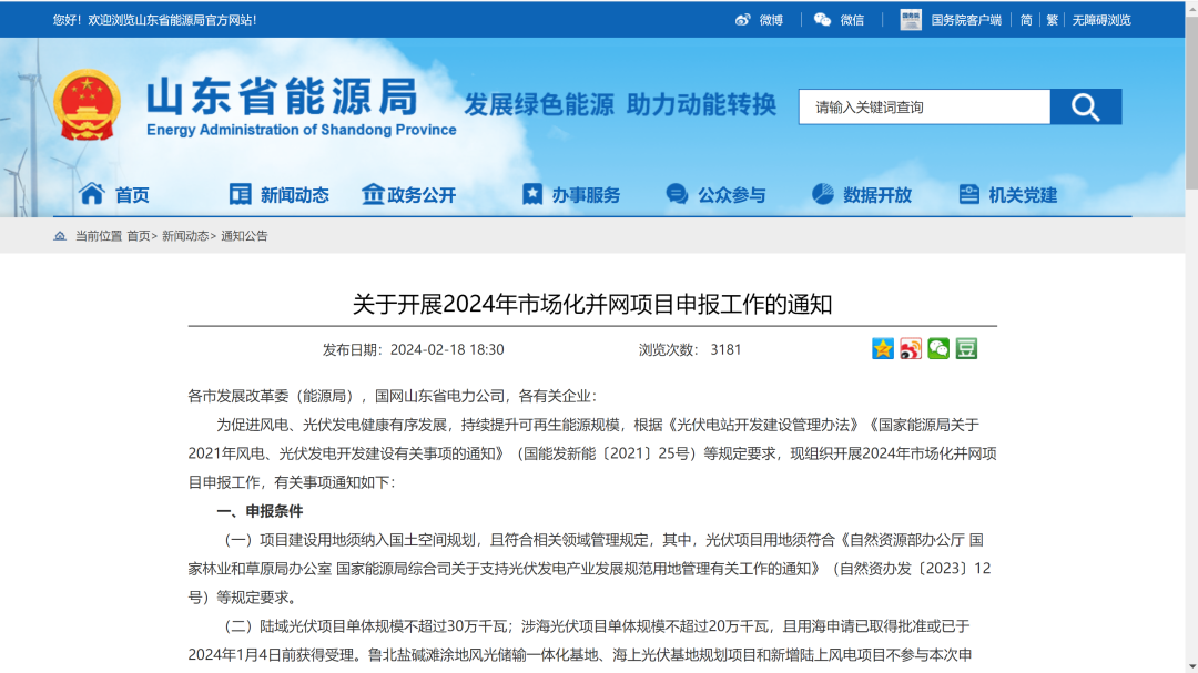 中國儲能網(wǎng)訊:2月18日,山東省能源局印發(fā)《關(guān)于開展2024年市場化并網(wǎng)項目申報工作的通知》。文件明確,陸域光伏項目單體規(guī)模不超過30萬千瓦,涉海光伏項目單體規(guī)模不超過20萬千瓦,且用海申請已取得批準(zhǔn)或已于2024年1月4日前獲得受理。