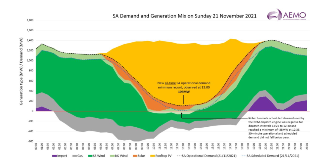 2021年10月,南澳州配電網(wǎng)又多次出現(xiàn)“負(fù)需求”現(xiàn)象(均發(fā)生在周日)。10月31日,當(dāng)?shù)嘏潆娋W(wǎng)的凈負(fù)荷連續(xù)4小時(shí)為負(fù)值,在13:00—13:30的半小時(shí)內(nèi)達(dá)到創(chuàng)紀(jì)錄的-69.4兆瓦,運(yùn)營(yíng)最低需求僅188兆瓦。2021年11月21日,隨著屋頂光伏出力增加,運(yùn)營(yíng)最低需求又降至104兆瓦。