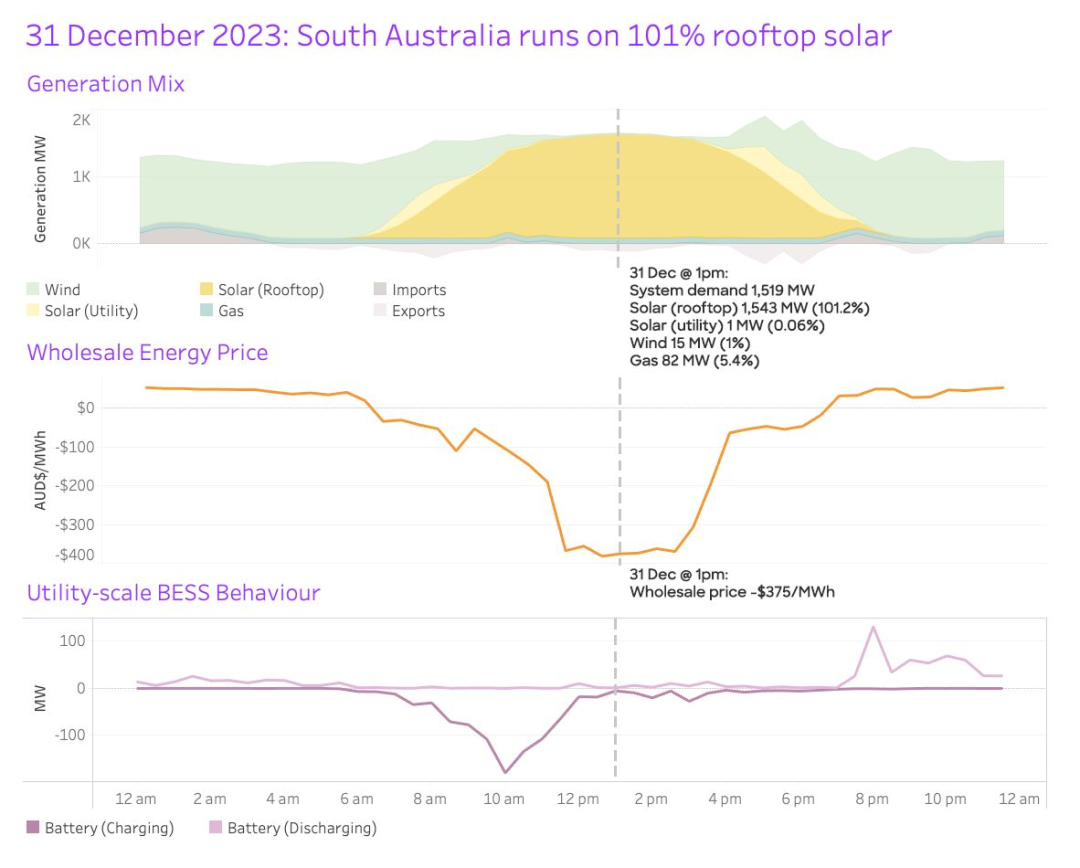 2023年12月31日下午,屋頂光伏發(fā)電可滿足南澳州101%的電力總需求。南澳州電網(wǎng)成為全球首個(gè)實(shí)現(xiàn)負(fù)運(yùn)營(yíng)需求(Operational Demand)的吉瓦規(guī)模電網(wǎng)。