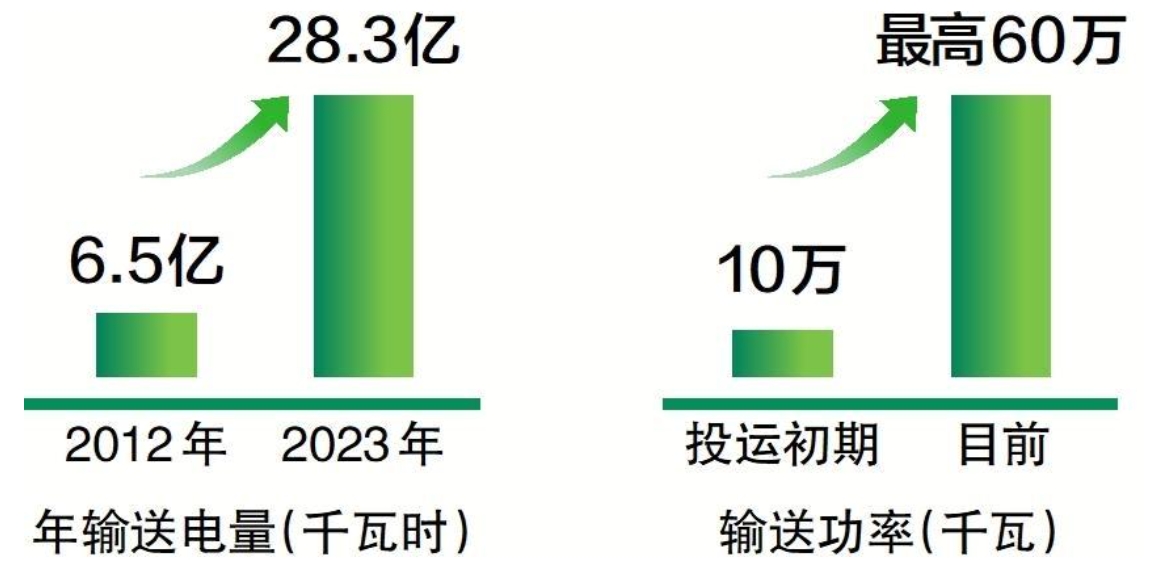 青藏聯(lián)網(wǎng)工程是第一個“電力天路”工程,于2011年12月建成投運(yùn),架起了連接青藏的能源“大動脈”,已安全平穩(wěn)運(yùn)行超12年。自工程投運(yùn)以來,柴拉直流系統(tǒng)雙向輸送能力不斷提升,輸送功率由投運(yùn)初期的10萬千瓦提升至目前的最高60萬千瓦,柴拉直流大功率運(yùn)行已成常態(tài)。自2015年起,這條能源大通道以西藏地區(qū)每年水電豐水期“藏電送青”、枯水期“青電入藏”的規(guī)律特性輸送電能,輸送電量逐年增長,年輸電量由2012年的6.5億千瓦時增長至2023年的28.3億千瓦時。