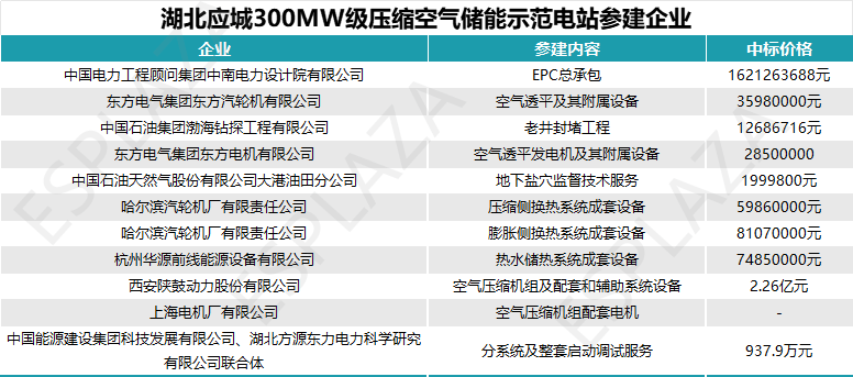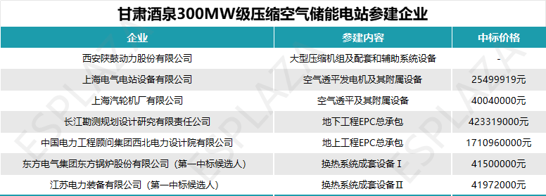 當(dāng)前,中能建數(shù)科湖北應(yīng)城300MW壓縮空氣儲能電站示范項目、甘肅酒泉300MW壓縮空氣儲能電站示范工程、山東泰安350MW壓縮空氣儲能創(chuàng)新示范項目等三大項目均在建設(shè)中。壓縮空氣儲能項目的建設(shè)需要多方的共同參與,ESPLAZA長時儲能網(wǎng)統(tǒng)計了目前參與這三大項目建設(shè)的相關(guān)公司。