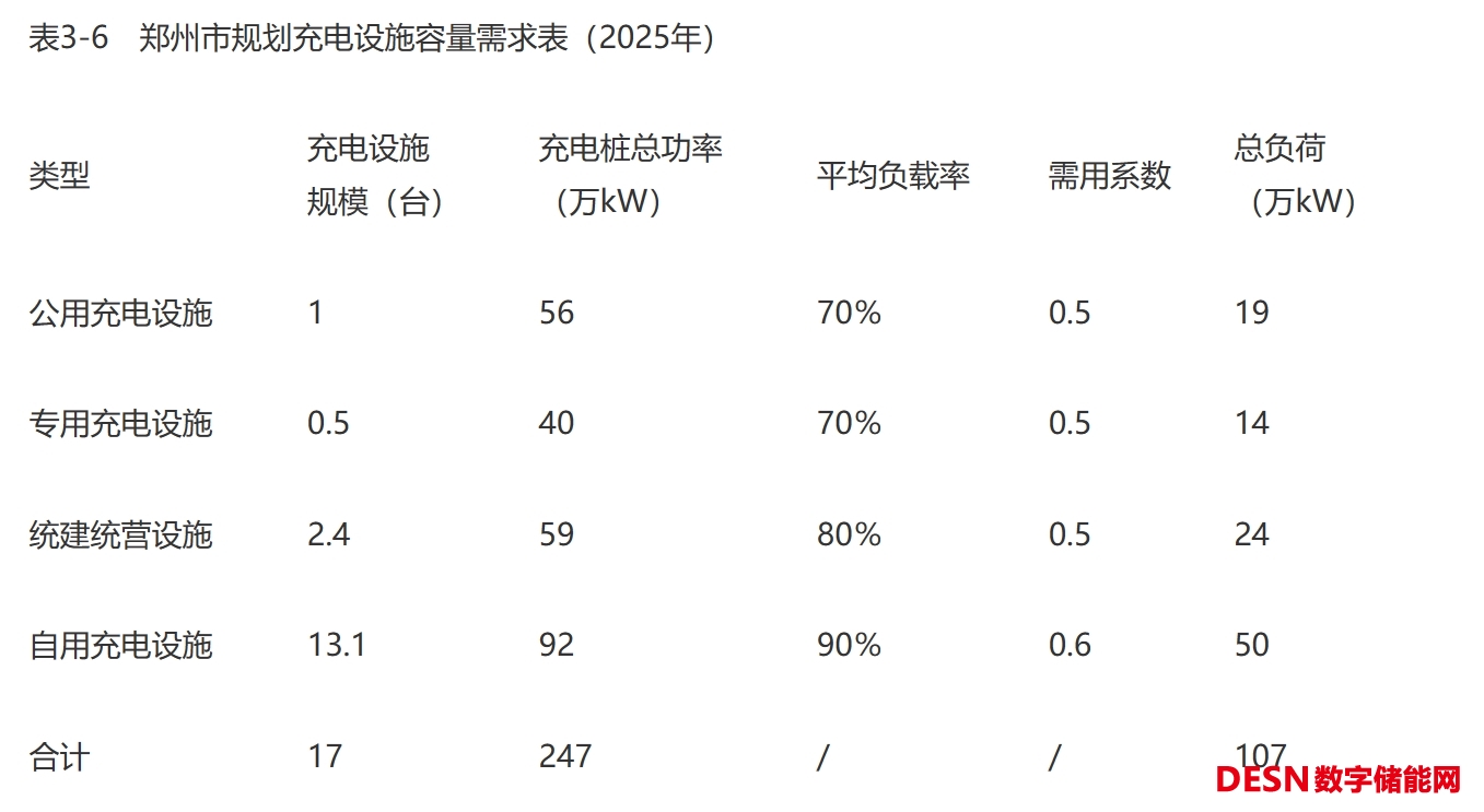 專用充電站直流充電設(shè)施按80kW/槍,公共充電站直流充電設(shè)施按80kW/槍,統(tǒng)建統(tǒng)營充電站直流充電設(shè)施按60kW/槍,自用交流樁按7kW/樁,其他交流樁按7kW/樁計(jì)算,規(guī)劃至2025年,鄭州市充電基礎(chǔ)設(shè)施總用電需求為107萬kW。