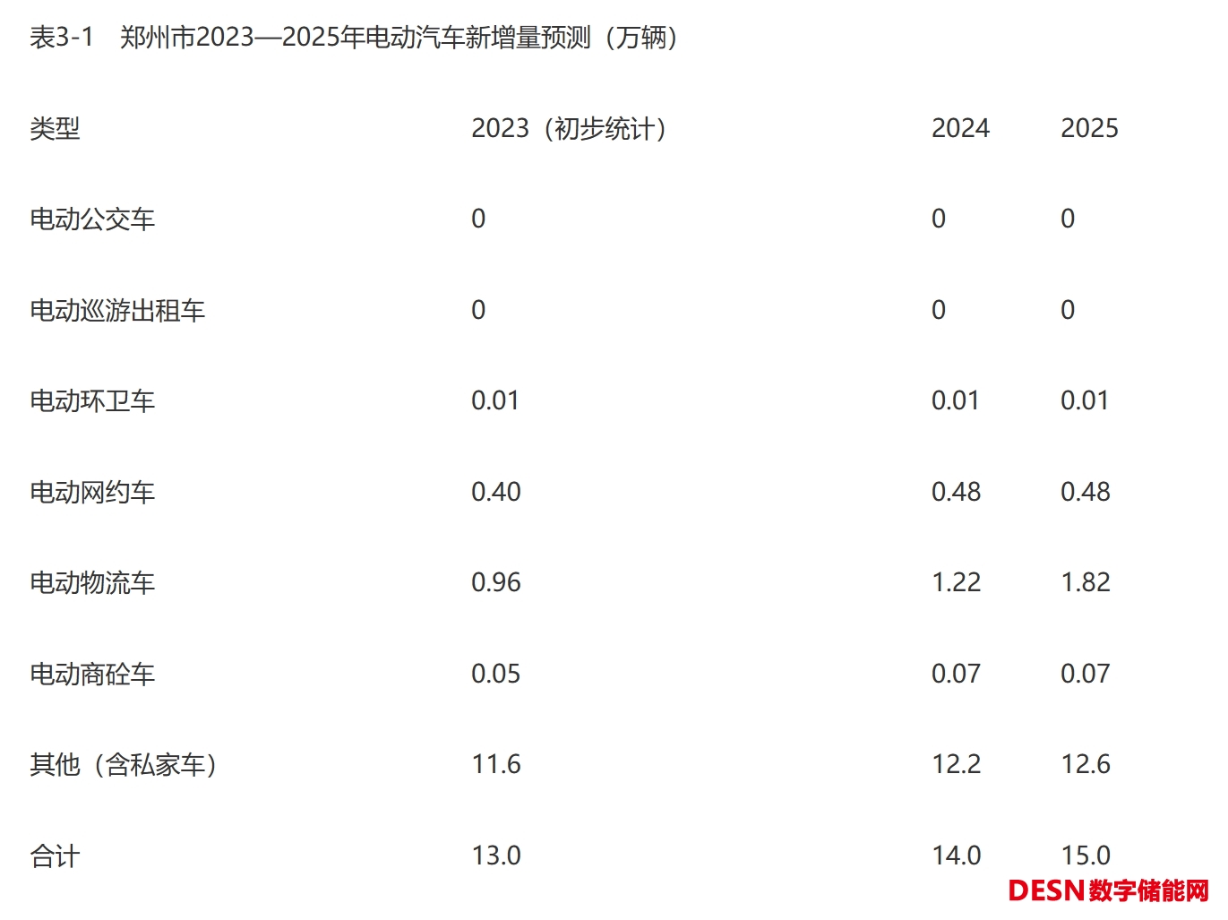 根據(jù)工業(yè)和信息化部等部門《關(guān)于組織開展公共領(lǐng)域車輛全面電動(dòng)化先行區(qū)試點(diǎn)工作的通知》(工信部聯(lián)通裝函〔2023〕23號(hào)),試點(diǎn)領(lǐng)域新增及更新車輛中新能源汽車比例顯著提高,其中城市公交、出租、環(huán)衛(wèi)、郵政快遞、城市物流配送領(lǐng)域力爭(zhēng)達(dá)到80%。本規(guī)劃原則上采用以上標(biāo)準(zhǔn),結(jié)合鄭州市實(shí)際調(diào)研情況進(jìn)行合理調(diào)整,2023—2025年各類型新能源汽車增量如下表所示。
