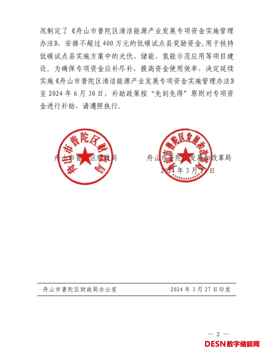 為規(guī)范普陀區(qū)清潔能源產(chǎn)業(yè)補(bǔ)助管理,提高省級低碳試點縣獎勵資金使用績效,根據(jù)《浙江關(guān)于開展低(零)碳試點建設(shè)的指導(dǎo)意見》(浙雙碳辦〔2021〕5號)及《浙江省財政廳 浙江省發(fā)展和改革委員會關(guān)于下達(dá)2022年低碳試點縣獎勵的通知》(浙財建〔2022〕42號)等文件相關(guān)規(guī)定,結(jié)合我區(qū)實際情況制定了《舟山市普陀區(qū)清潔能源產(chǎn)業(yè)發(fā)展專項資金實施管理辦法》,安排不超過400萬元的低碳試點縣獎勵資金,用于扶持低碳試點縣實施方案中的光伏、儲能、氫能示范應(yīng)用等項目建設(shè)。為確保專項資金應(yīng)補(bǔ)盡補(bǔ),提高資金使用效率,決定延續(xù)實施《舟山市普陀區(qū)清潔能源產(chǎn)業(yè)發(fā)展專項資金實施管理辦法》至2024年6月30日,補(bǔ)助政策按“先到先得”原則對專項資金進(jìn)行補(bǔ)助,請遵照執(zhí)行。