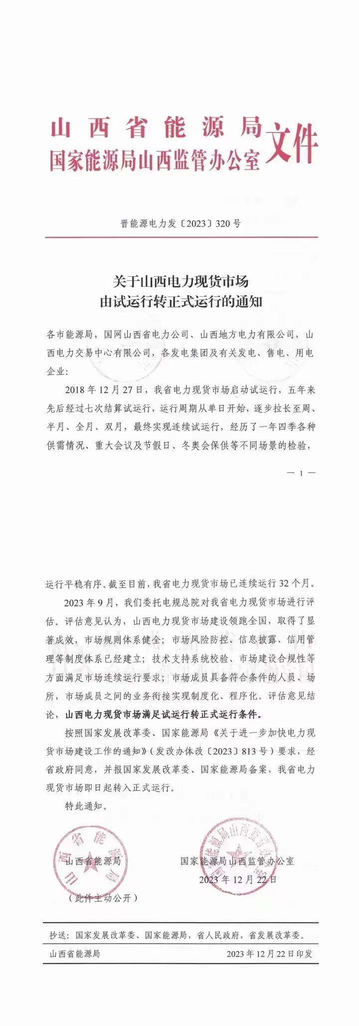 中國(guó)儲(chǔ)能網(wǎng)訊:12月22日,山西省能源局 山西能監(jiān)辦發(fā)布《關(guān)于山西電力現(xiàn)貨市場(chǎng)由試運(yùn)行轉(zhuǎn)正式運(yùn)行的通知》,山西省電力現(xiàn)貨市場(chǎng)即日起轉(zhuǎn)入正式運(yùn)行!