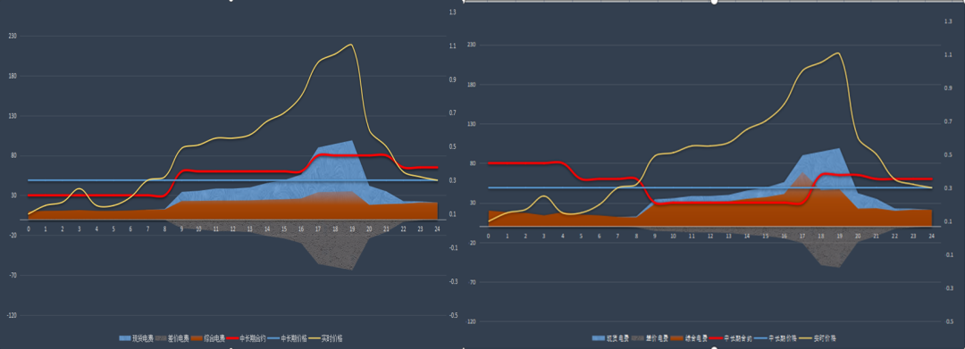 當(dāng)市場(chǎng)來臨的時(shí)候,部分國(guó)有發(fā)電企業(yè)的經(jīng)營(yíng)模式并沒有調(diào)整到位,可能存在經(jīng)營(yíng)決策失誤的原因。例如,中長(zhǎng)期簽約時(shí)未充分考慮自身節(jié)點(diǎn)和用戶側(cè)現(xiàn)貨價(jià)格的差異,不同發(fā)電企業(yè)、不同用戶一個(gè)策略,簡(jiǎn)單粗暴,不管簽?zāi)牡挠脩舳际且粋€(gè)價(jià),只重視合同價(jià)格的高低,不考慮價(jià)差電費(fèi)的高低,有些甚至不在合同中約定分時(shí)價(jià)格。如圖4所示,左圖與右圖用戶電量相同,左圖用戶合同價(jià)為0.4元/度,右圖用戶合同價(jià)為0.3元/度,兩個(gè)用戶用電曲線形狀不同,其他均相同。從大烏海區(qū)域部分電源的選擇來看,顯然更喜歡左圖用戶,然而事實(shí)卻告訴我們:由于右圖用戶價(jià)差電費(fèi)要遠(yuǎn)高于左圖用戶的價(jià)差電費(fèi),最終的結(jié)算結(jié)果是合同價(jià)低25%的右圖用戶可以為電源帶來的電費(fèi)(紅色部分)高于左圖用戶。