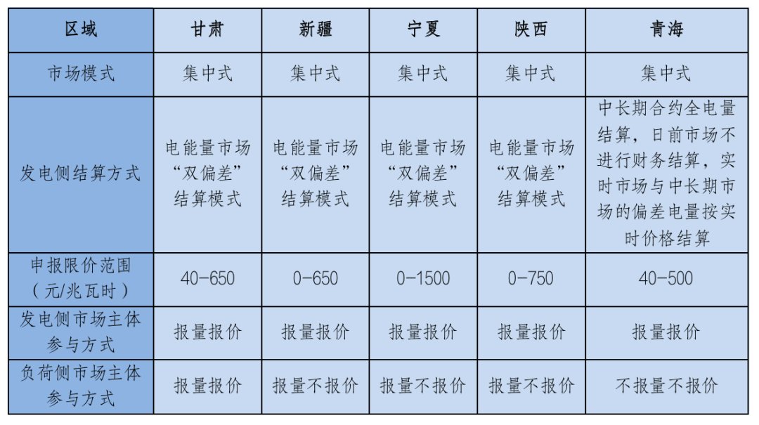 進(jìn)入2023年后,西北五省現(xiàn)貨市場(chǎng)建設(shè)加速,筆者基于各省電力現(xiàn)貨市場(chǎng)建設(shè)方案及配套文件,梳理了各省省內(nèi)現(xiàn)貨市場(chǎng)模式、結(jié)算方式、申報(bào)限價(jià)及市場(chǎng)主體申報(bào)方式等信息。