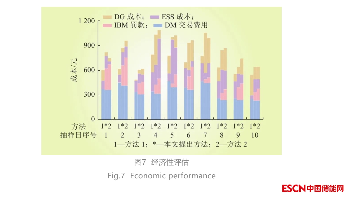 圖7展示了在所抽取的10天中3種方法運行成本的對比??偟某杀景?個部分:DG成本、ESS成本、IBM罰款和DM交易費用。整體的調度成本可以理解為設備成本(DG和ESS成本)和電力市場交易成本(IBM罰款和DM交易成本)。DG和ESS成本指的是在經過日前和日內階段的調度之后兩種設備實際所產生的成本。VPP與電力市場的交易結算是兩階段的,其中IBM罰款指的是在日內階段因為與電網(wǎng)的交易電量與日前計劃不符所產生的相關罰款;DM交易費用是指在日前階段與電力市場簽訂的次日購/售電合約中的電量所產生的交易費用。