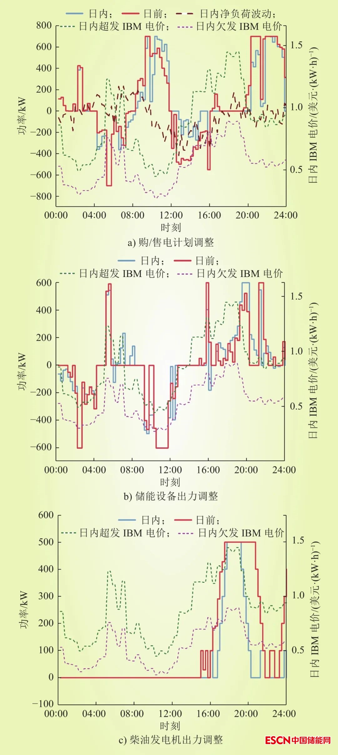 圖6展示了日內階段虛擬電廠各個單元的出力相較于日前計劃的調整,從圖6 a)可以看出,日內的交易計劃大致上完成了對日前計劃的跟蹤。在日內階段,實際的風電出力、光伏出力和負荷的數(shù)值與日前預測結果存在偏差,因此虛擬電廠需要協(xié)同調節(jié)內部儲能設備和可控柴油發(fā)電機的出力來消除出現(xiàn)的凈負荷波動,同時盡可能跟蹤日前交易計劃以減少IBM的罰款。虛擬電廠對日前計劃的調整和當前時刻的IBM電價和凈負荷波動有著直接的聯(lián)系,08:00—12:00,虛擬電廠對于交易計劃的調整較大,因為此時的IBM電價較低,直接承擔罰款相較于調節(jié)設備出力更為劃算。而在IBM電價較高的05:00—06:00和18:00—20:00,虛擬電廠對于交易計劃的調整較少,而是由儲能設備和柴油發(fā)電機協(xié)調彌補凈負荷出現(xiàn)的波動,以減少整體運行成本。