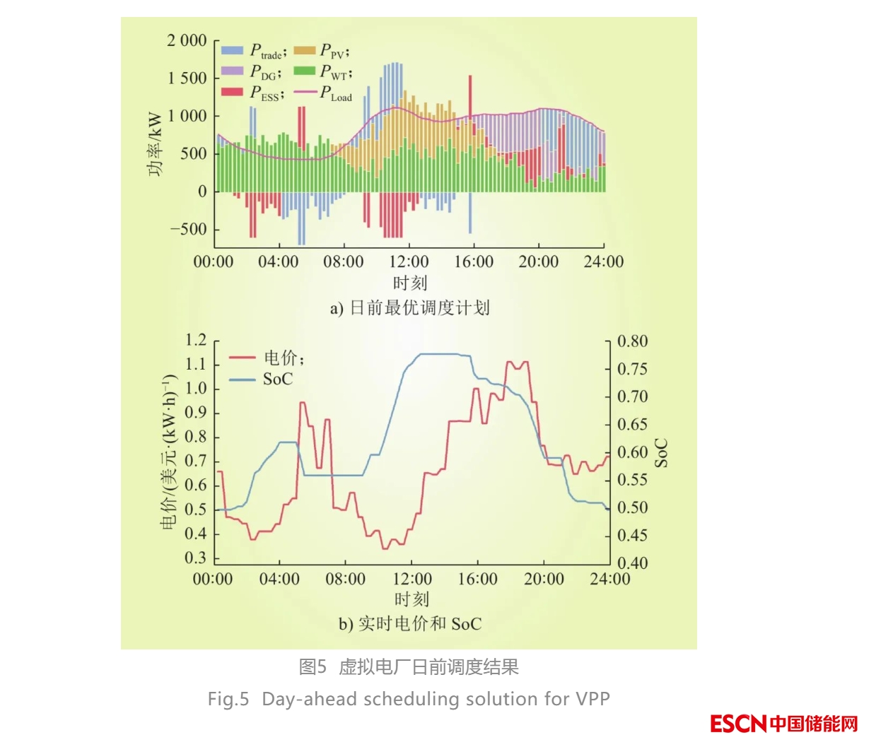 日前階段,虛擬電廠各個設備運行計劃如圖5 a)所示,日內電價和儲能設備SoC變化如圖5 b)所示。