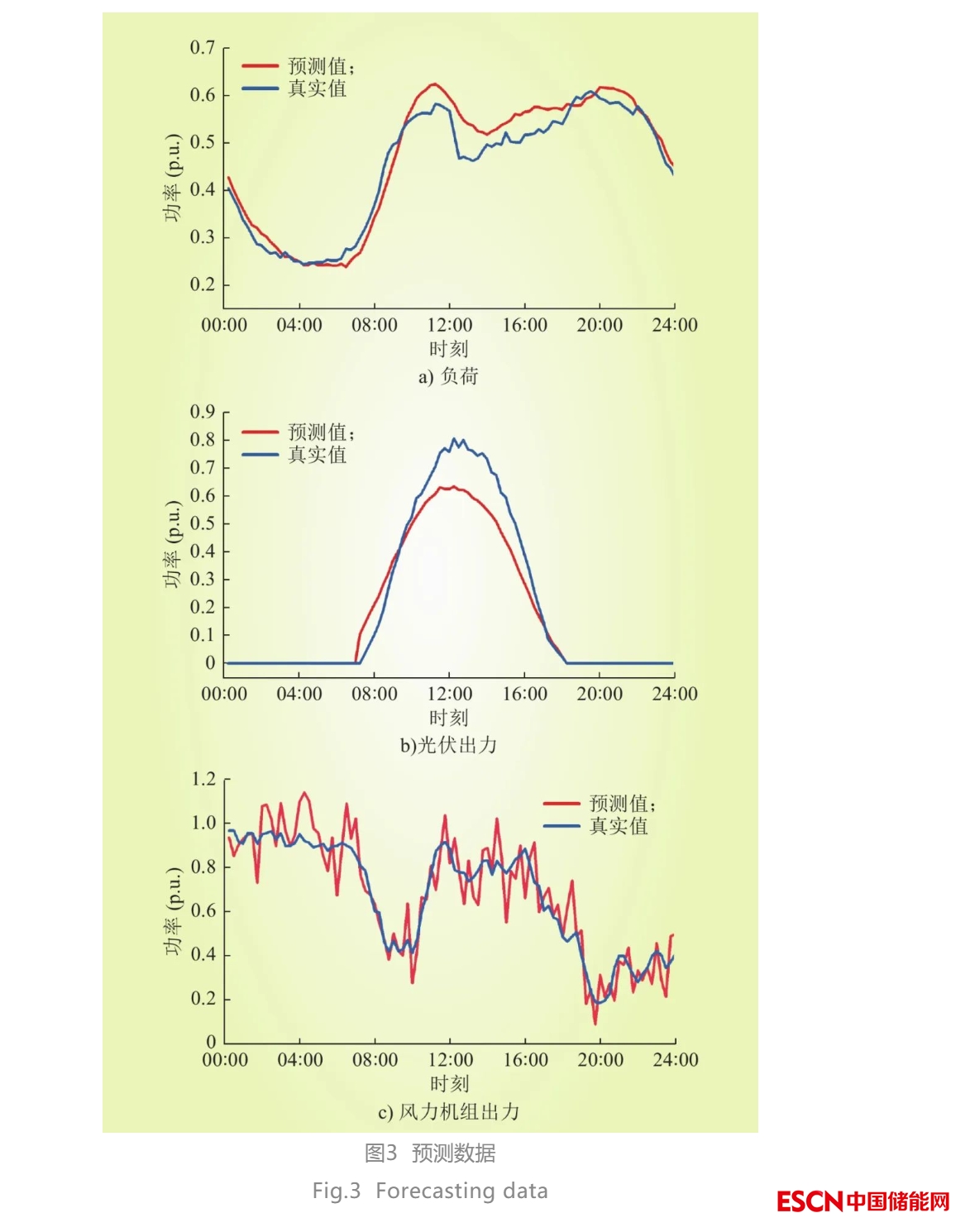 在本文的工作中,輸入到LSTM中的數(shù)據(jù)為兩天前的真實歷史數(shù)據(jù),輸出數(shù)據(jù)為次日一整天的出力數(shù)據(jù),其時間分辨率為15 min??紤]到風力發(fā)電固有的隨機性和波動性,其預測精度很難保證,因此本文假設風力發(fā)電的預測誤差滿足正態(tài)分布[24]。本文使用某地區(qū)一年的歷史數(shù)據(jù)(時間間隔為5 min)訓練網(wǎng)絡使其學習時間序列的內在規(guī)律,為了方便網(wǎng)絡學習,數(shù)據(jù)在使用前進行了歸一化處理。預測結果如圖3所示。