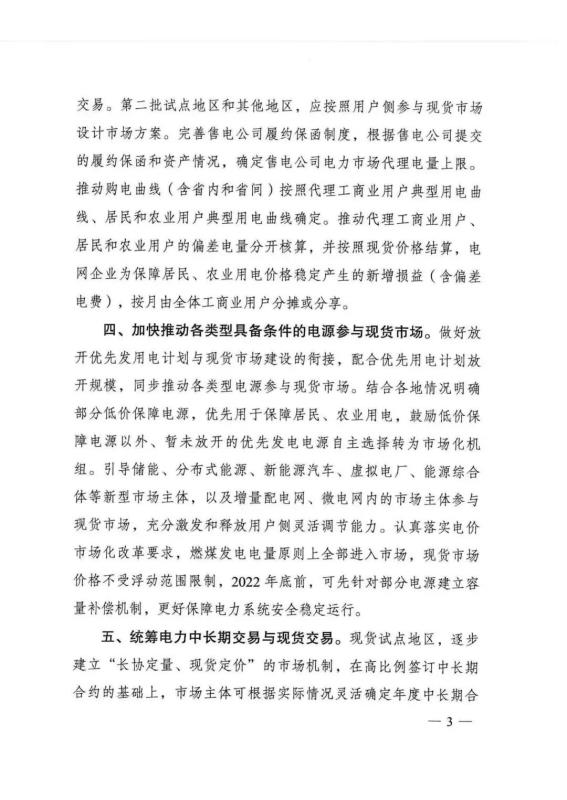 二是加快推動(dòng)各類型具備條件的電源參與現(xiàn)貨市場(chǎng)。做好放開(kāi)優(yōu)先發(fā)用電計(jì)劃與現(xiàn)貨市場(chǎng)建設(shè)的銜接,配合優(yōu)先發(fā)用電計(jì)劃放開(kāi)規(guī)模,同步推動(dòng)各類型電源參與現(xiàn)貨市場(chǎng)。引導(dǎo)儲(chǔ)能、分布式能源、新能源汽車、虛擬電廠等新型市場(chǎng)主體,以及增量配電網(wǎng)、微電網(wǎng)內(nèi)的市場(chǎng)主體參與現(xiàn)貨市場(chǎng),充分激發(fā)和釋放用戶側(cè)靈活調(diào)節(jié)能力。2022年底前,可先針對(duì)部分電源建立容量補(bǔ)償機(jī)制,更好保障電力系統(tǒng)安全穩(wěn)定運(yùn)行。