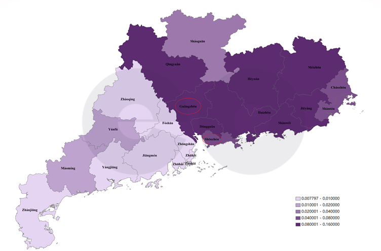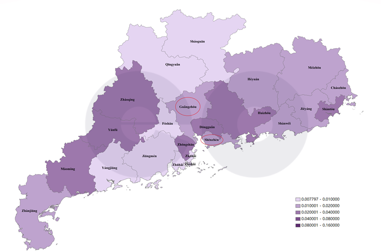 研究發(fā)現(xiàn),惠州、東莞、中山和汕頭等區(qū)域市場(chǎng)勢(shì)力較大的城市均位于廣州和深圳(圖中紅圈部分)周圍。由于廣州和深圳的用電量占全省30%以上,當(dāng)電能量從周邊城市輸送到廣州和深圳時(shí),增加了周圍城市所需的負(fù)荷;同時(shí),電力輸送面臨阻塞的風(fēng)險(xiǎn),進(jìn)而產(chǎn)生了區(qū)域市場(chǎng)勢(shì)力。圖8b有效說(shuō)明了全省電力負(fù)荷較高時(shí),廣州和深圳周邊廣泛的城市受到區(qū)域市場(chǎng)勢(shì)力的影響,在與廣州和深圳緊密相連的東北區(qū)域,這一影響尤為突出。